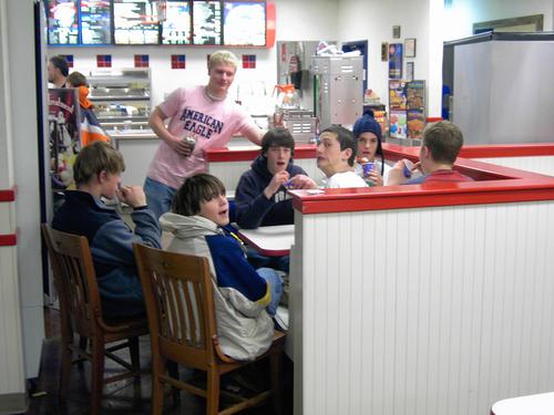 | Power eating. Left to right: Mason Smith, Matt Buller (standing), Jonathan Wingate, Garrett Hall, Matt Sangster, Bradley Beckner, Casey Fithen (facing away). | View from the hill. Patrol Meeting. Left to right: Christian Herrmann, Matt Sangster, Bradley Beckner, Jonathan Wingate, Mason Smith. |