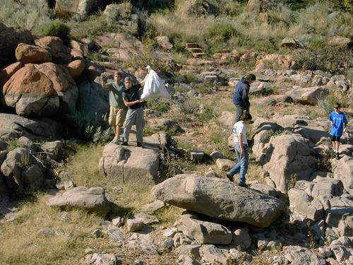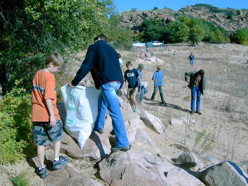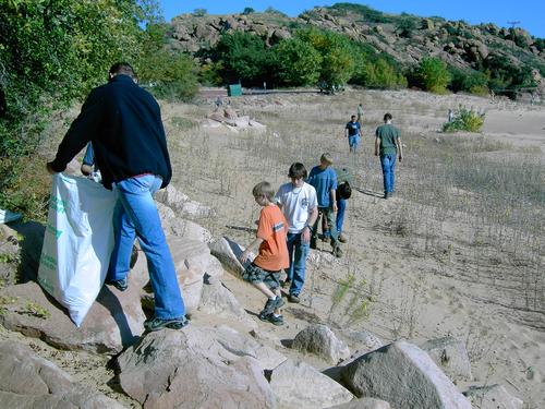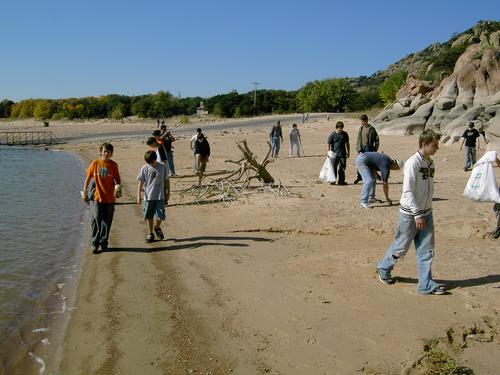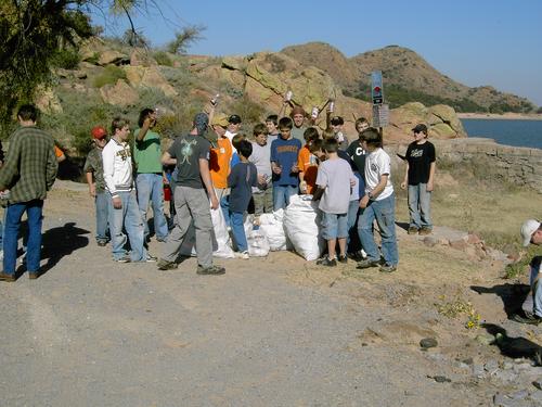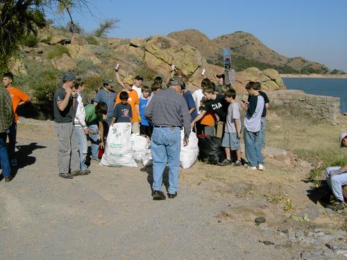 For its service project to help the Park Rangers (and to pay some of its camping fees), Troop 80 picked up trash at the boat dock and swimming area, and also cleaned the swimming area of rocks. |
