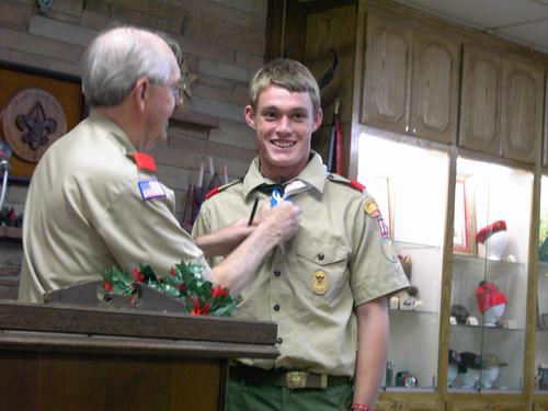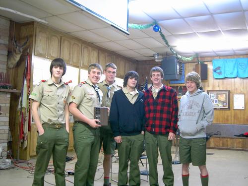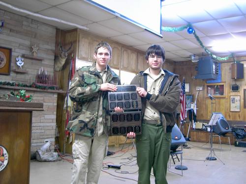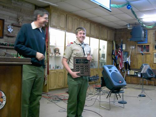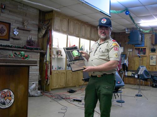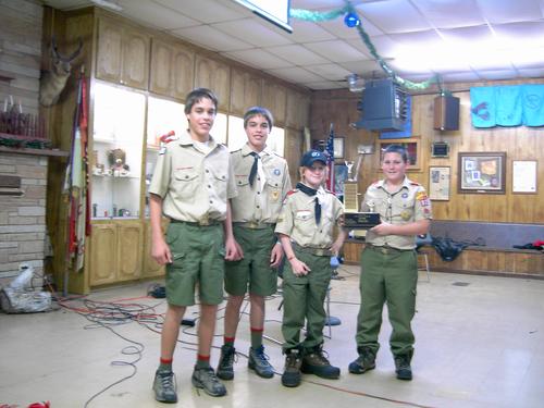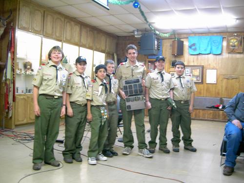 The 2005 Troop 80 Family Christmas Banquet, held on December 13 at the Jack Bryant Scout Center, was a delicious meal catered by JT’s and Troop 80’s own Brandon Merrill. The evening was also a celebration of both a great year of scouting and a celebration of many years of dedication and commitment for some men who are hanging up their black hats after many years of service to the families of Troop 80. The troop honored Paul Kiefer for 17 years of working both as finance committee chairman and chef extraordinaire. Jim Altsman served 10 years as advancement chairman, a really tough job to tackle. Also honored for their long years of dedication were Committee Chairman James Savage, who has worked with the troop under various titles since 1983, and Scoutmaster Eric Wolfram, both of whom earned their Eagle rank with Troop 80. Eric worked as an ASM while attending Amarillo College, and went back to work with the Troop as soon as he and his family moved back to Amarillo after law school. He has officially been Scoutmaster for 20 years. Many thanks to all of these men for all that they have contributed to Troop 80. Other highlights included: