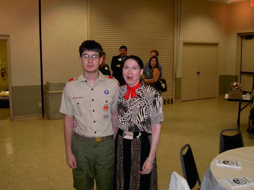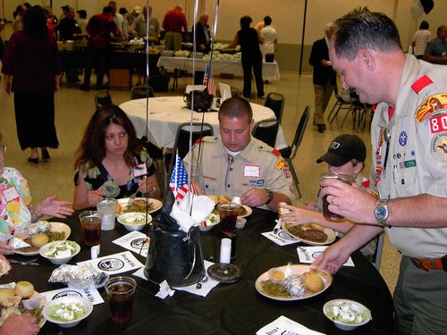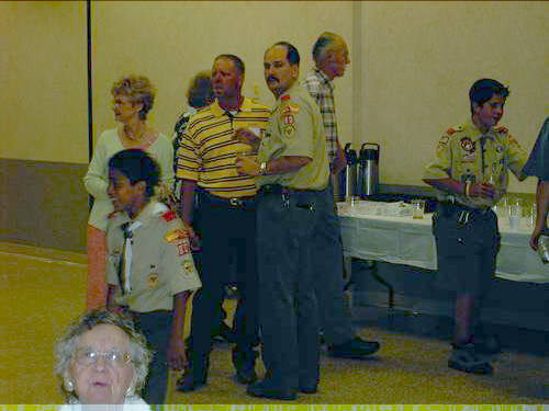 | Dr. Steve Banks being patient (a Troop virtue). David Worthen walking out. Jim White and Mary White waiting their turn. | Charlie Phillips and Kiki Osborne. Steve Banks with son John Aiden Banks being held by John Banks (out of sight). |
