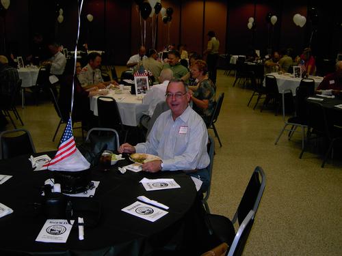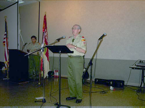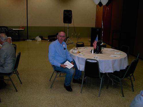 | James Savage telling audience not to be too freaked out by the war stories from 50's and 60's. Mike Alexander, Dale Denny and Chuck Morgan hope that the statute of limitations has run out. | James Savage hoping Walter Wolfram does not speak too long (not that it ever happened before). |