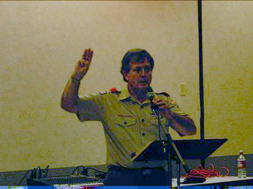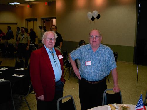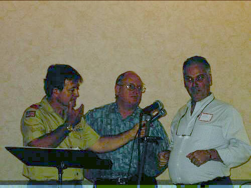 | James Savage trying to get the crowd quiet. Yeah, ... right. | Dale Denny telling James Savage "how it used to be." Mike Alexander feeding lines to Dale. |