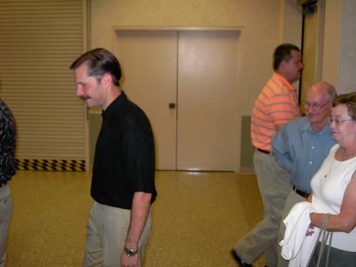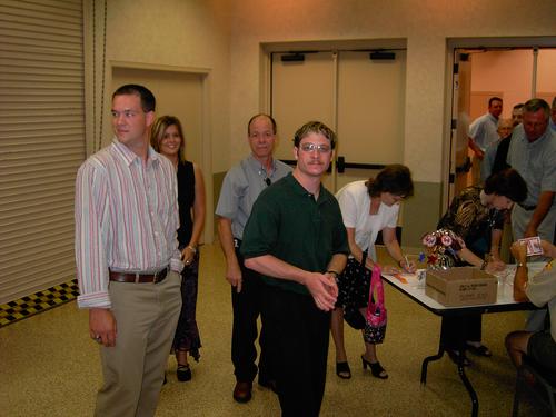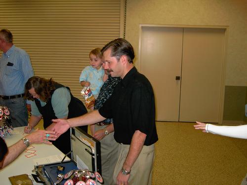 | Justin Smiley, Jennifer Smiley, Randy Smiley, Josh Smiley, Jeanetta Smiley, LaDonna Tunnell, Garry Wood (the one asking LaDonna to cover his ticket). Robert Thurston is still out in the hall. | Garry Wood, Charlie Phillips and Kiki Osborne. David Worthen says hello to John Banks in line. Money Changers are Duane Glasco, Paul Kiefer, and Chris Robles. |