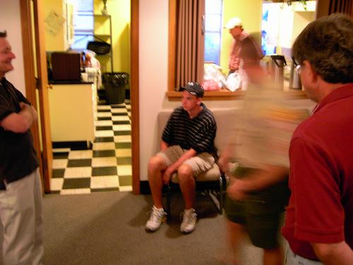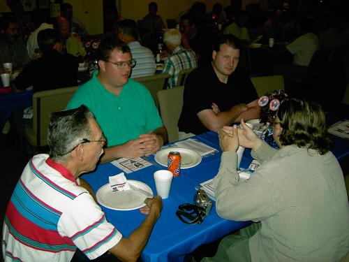 | Brad Eck (1996) and David Eck (Committee), Josiah Krulik (2004), Walter Wolfram (Assistant Scoutmaster), Brent Naylor (2000) waiting to eat. James Spencer (1995) welcoming Nick Kritselis (1987), a/k/a working the crowd. | James Spencer (1995) chillin' with Rich Kritselis (Assistant Scoutmaster) and Nick Kritselis (1987). Nick came all the way from Seattle, Washington. |