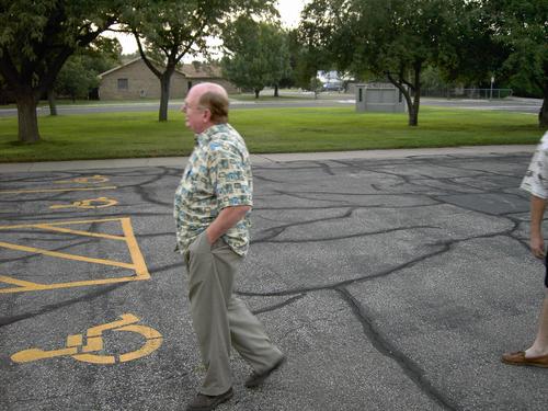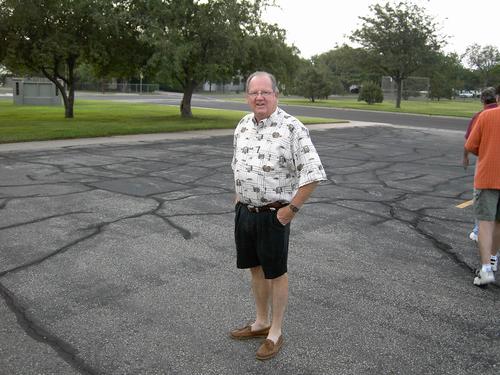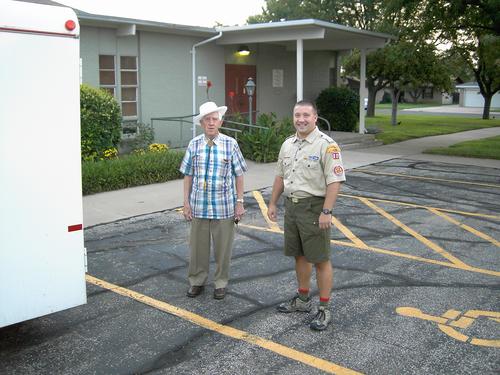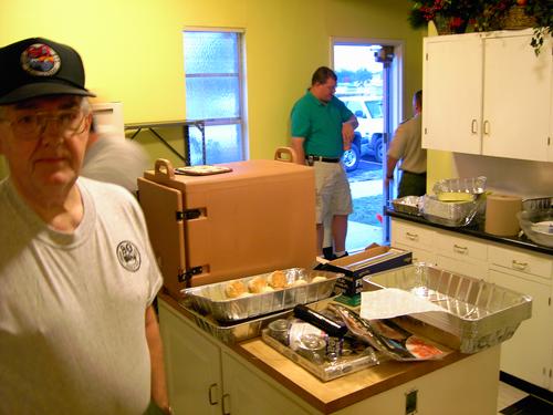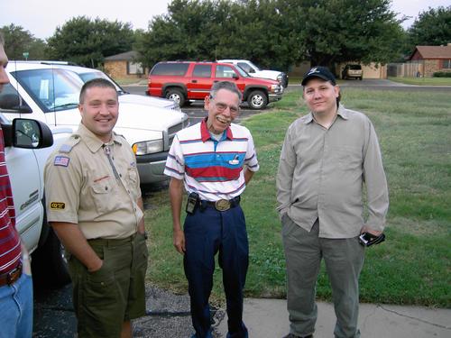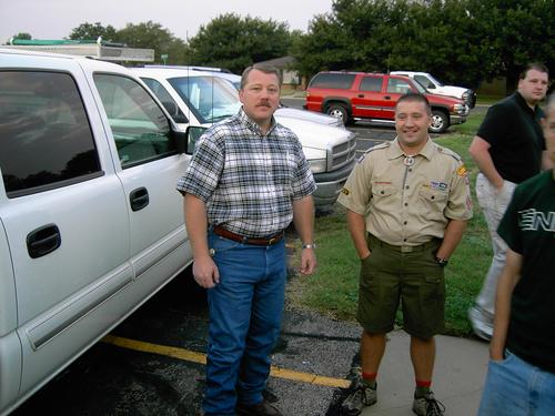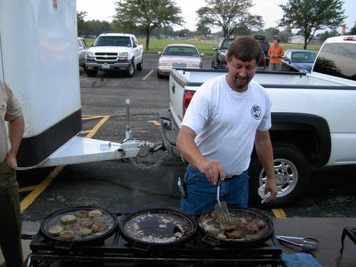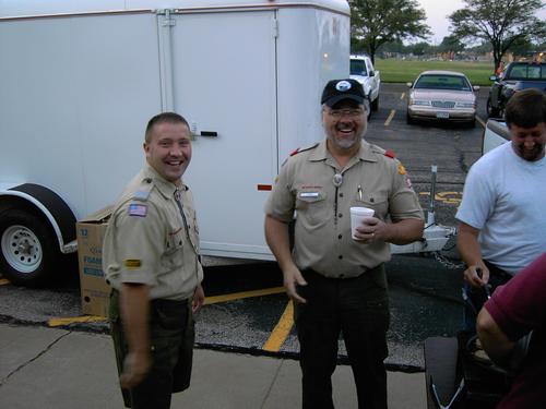 | John Standish (Assistant Scoutmaster) and James Spencer (1995) thanking and congratulating each other on their job of supervision. Well, ... Thank You ! | Stan Fithen (Assistant Scoutmaster) still cooking. At least he was working. John Cowden (1973) is hanging out in the parking lot. |
