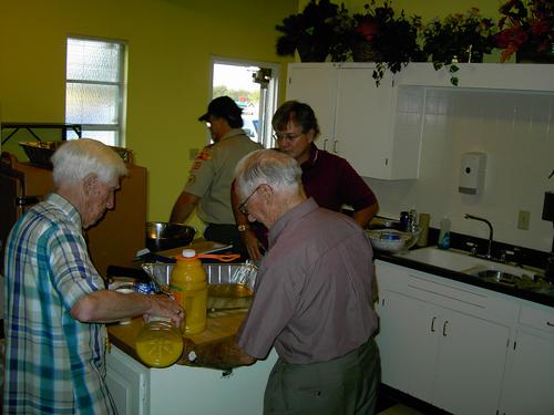 | Jim Thompson (Assistant Scoutmaster) finishing up food preparation. | Browning McCollum (1988) and James Spencer (1995) trying to help James Savage (1966) out. |