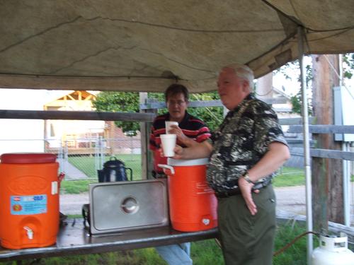 | Fred Poppe talks to Marshall Cutright, Jr., who is holding his newly bought reunion gear. | Drew Skipworth and Duane Glasco visit under the tent. |
